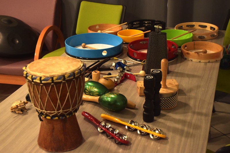 Certaines se jouent à la main, d’autres avec une mailloche ou un bâton. Certaines sont sonores, d’autres plus discrètes, obligeant chacun à nuancer son jeu, à appréhender la manière de l’utiliser, à trouver celle qui lui convient au fur et à mesure des séances…