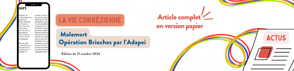 « Opération brioches par l’Adapei. Jusqu’au 20 octobre, opération brioches de l’Adapei de la Corrèze afin de réunir des fonds pour tenter d’améliorer les conditions de vie des personnes en situation de handicap mental. Envie de vous régaler, de permettre d’améliorer le quotidien et de réaliser des projets de proximité impliquant toutes les personnes en
