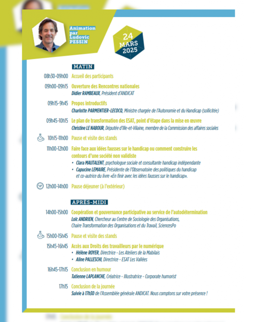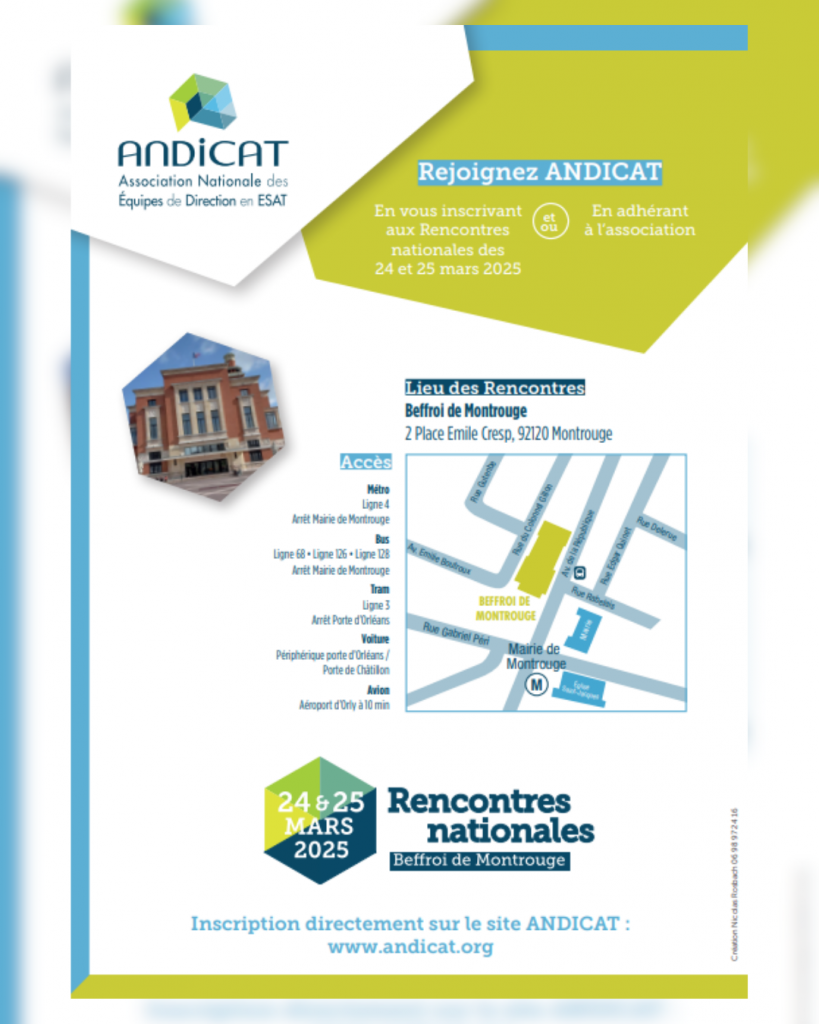 Andicat, (Association Nationale des Equipes de Direction en ESAT) organise les Rencontres Nationales 2025, qui se tiennent aujourd’hui et demain ; un événement clé pour réfléchir aux grands enjeux actuels des ESAT (Établissements et Services d’Aide par le Travail).