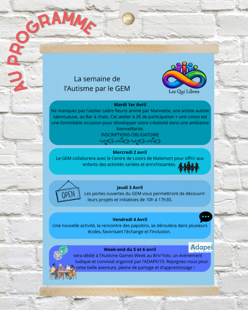 Dans ce cadre le GEM TSA 19 vous ouvre ses portes le jeudi 3 avril, de 10h à 17h30, au 20 rue Navier, 19100 Brive.