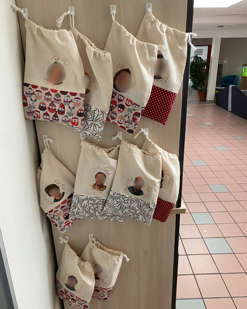 Les résidents ont réalisé avec soin des pochettes en tissu pour ranger leur serviette de table. Fini les serviettes en papier, et place au durable !